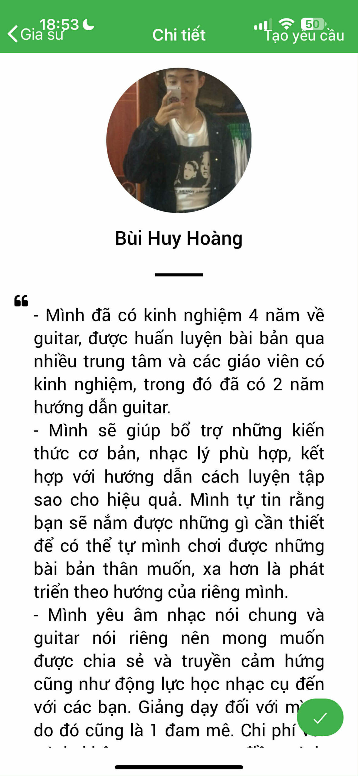 Mục tiêu của gia sư Guitar tại Daykemtainha.vn không chỉ dừng lại ở việc giúp học viên biết cầm đàn hay chơi vài hợp âm cơ bản, mà còn hướng đến việc xây dựng nền tảng âm nhạc vững chắc. Daykemtainha.vn luôn mong muốn mỗi học viên sau khi học đều có thể tự tin chơi nhạc, hiểu được giai điệu, tiết tấu và cảm nhận sâu hơn về âm nhạc.